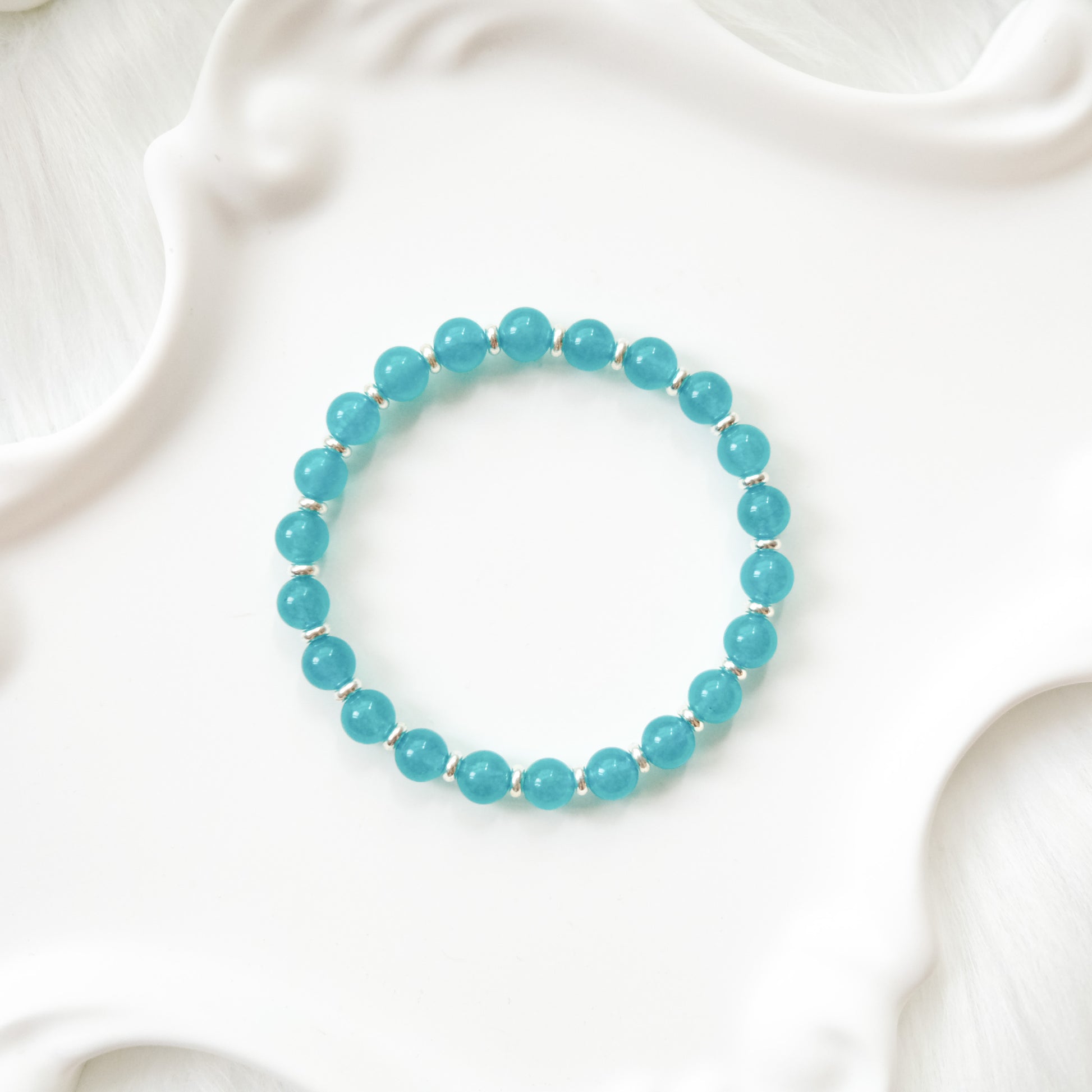 This bracelet is handcrafted with natural Amazonite beads known for their vibrant teal-to-aqua tones.