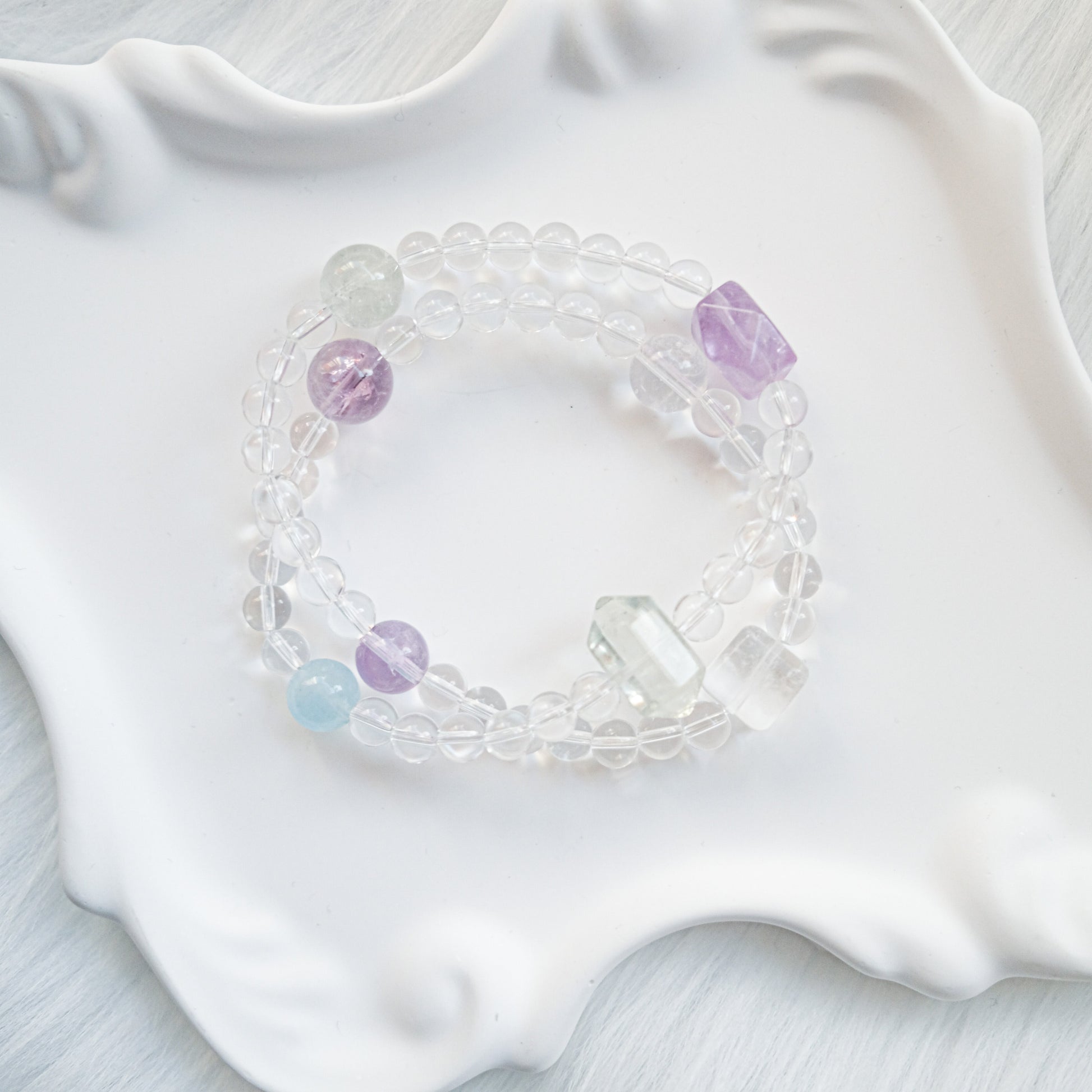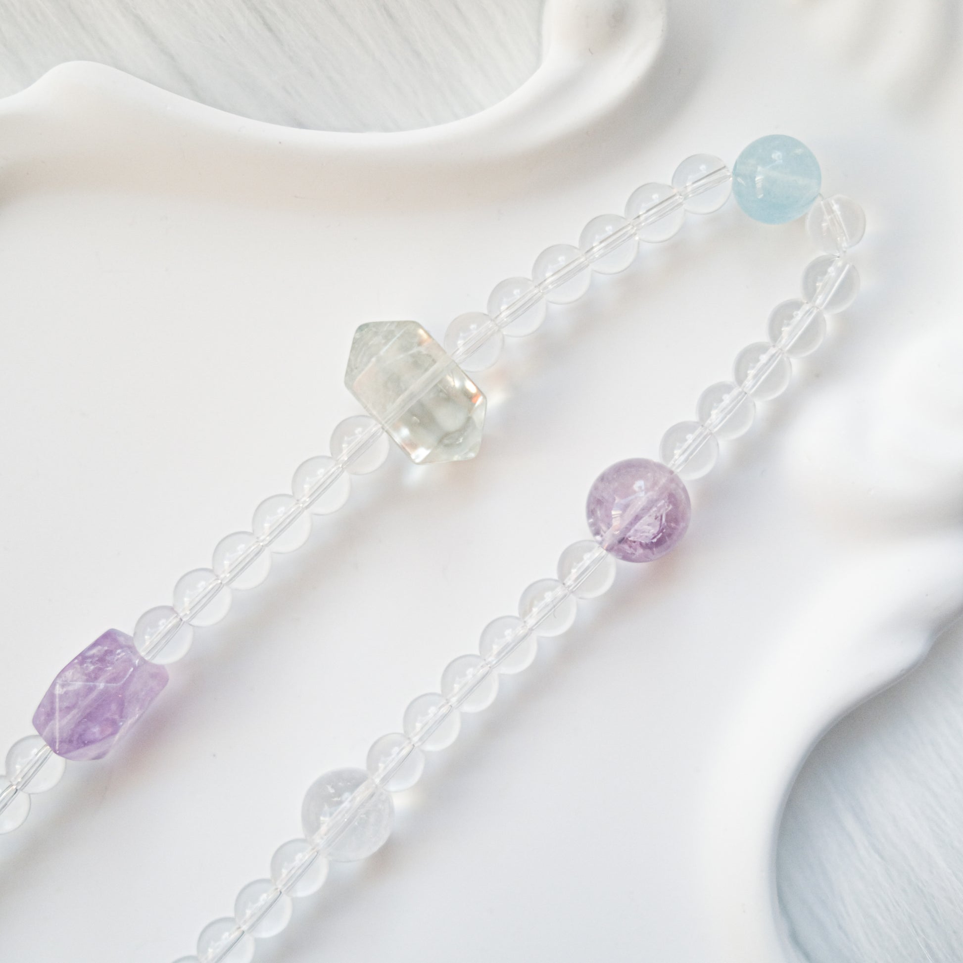 Together, these stones create a soft and harmonious gradient — balancing clarity, intuition, tranquility, and emotional renewal.