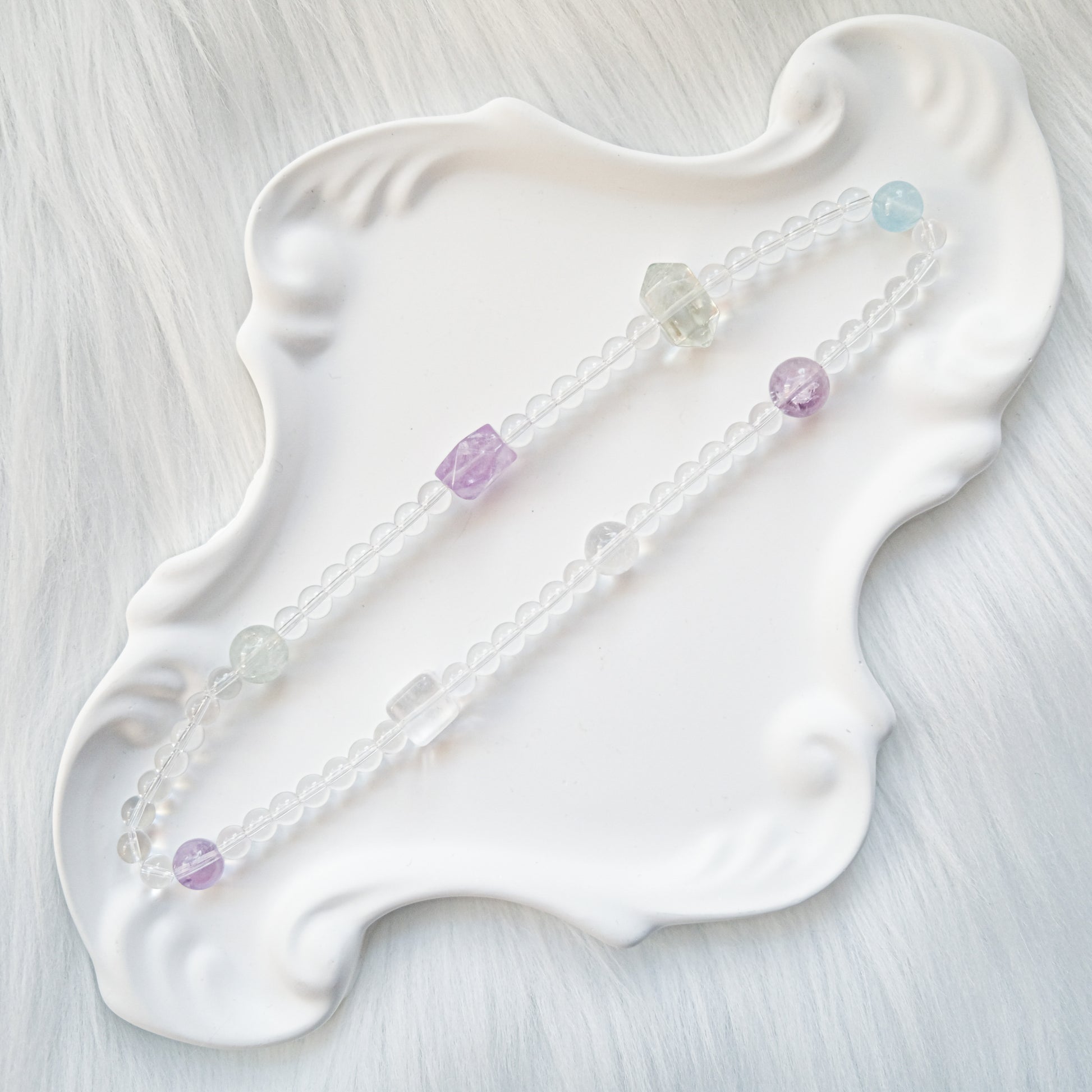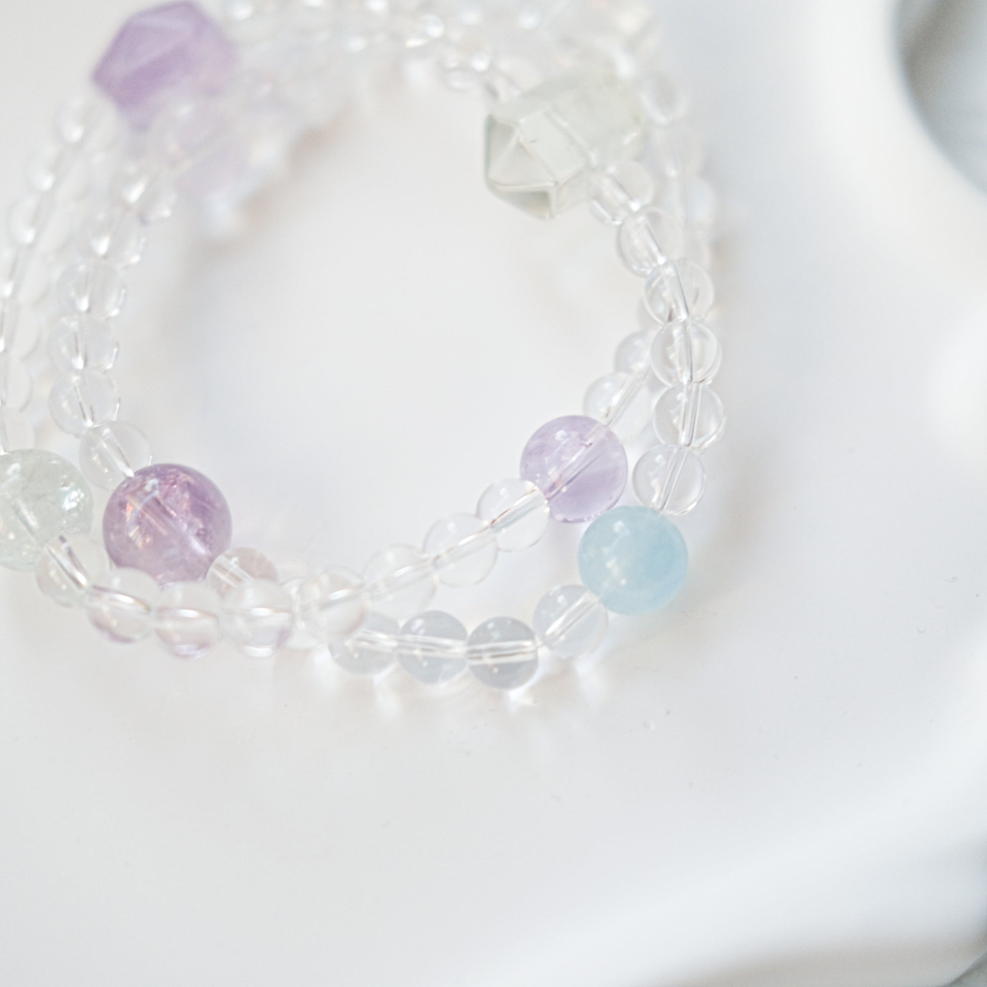 This bracelet is designed for those seeking quiet clarity, emotional softness, and gentle inner alignment. A serene pastel palette of Green Quartz, Amethyst & Aquamarine creates a calm yet uplifting energy flow.