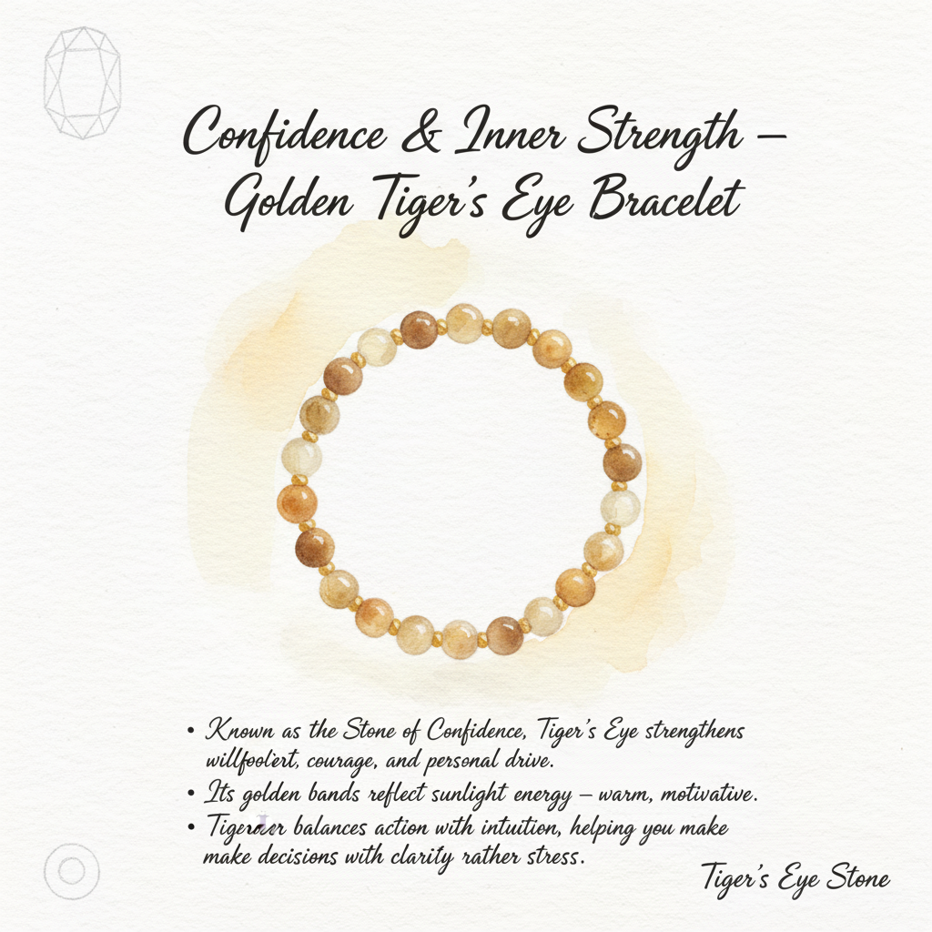 With its natural sheen and warm earth-gold tone, Golden Tiger’s Eye channels both grounding and radiant uplift — a perfect harmony between stability and motivation.