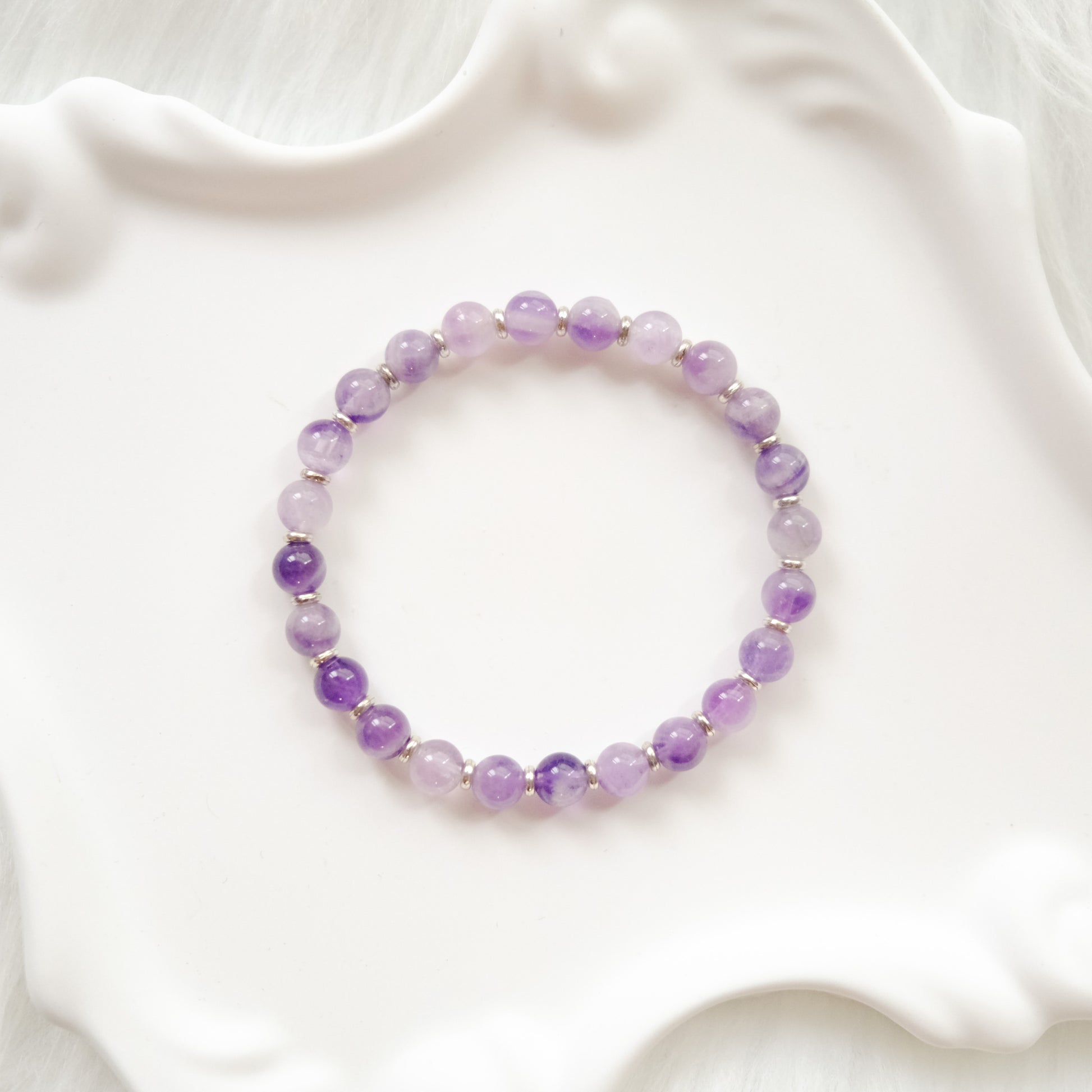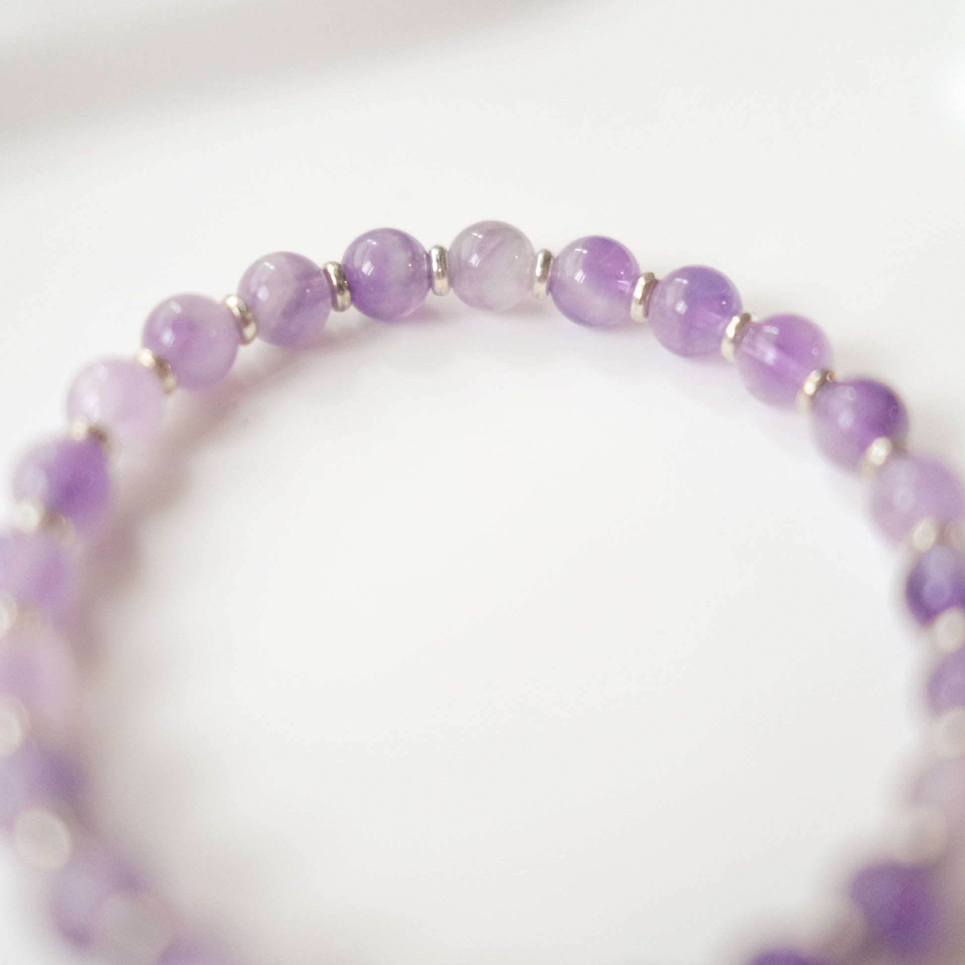 Each bracelet is handcrafted using natural Amethyst beads, individually selected for their luminous transparency and soft variations in color. Silver-toned spacers add a refined touch, enhancing the crystal’s gentle glow.