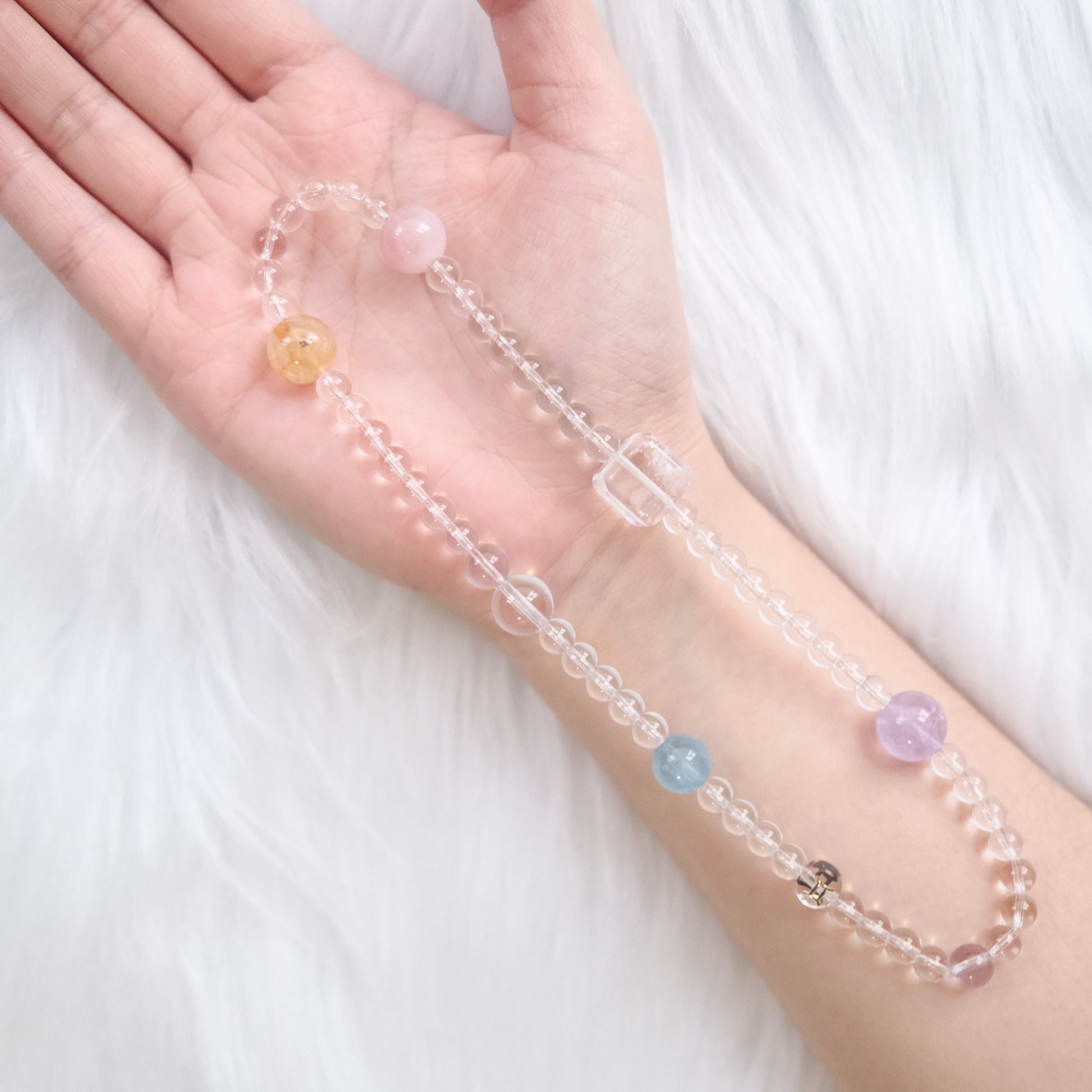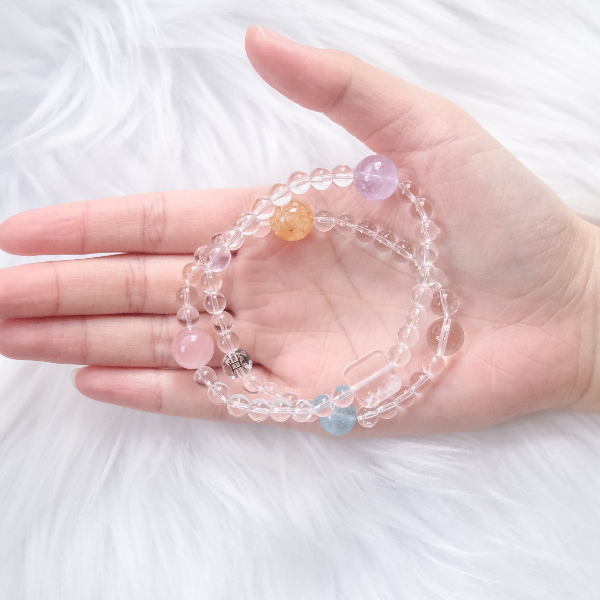 Aquamarine activates the Throat Chakra, supporting communication, while Amethyst and Clear Quartz align with the Third Eye and Crown Chakras, enhancing awareness and focus. Rose Quartz gently opens the Heart Chakra, grounding expression in empathy and connection.