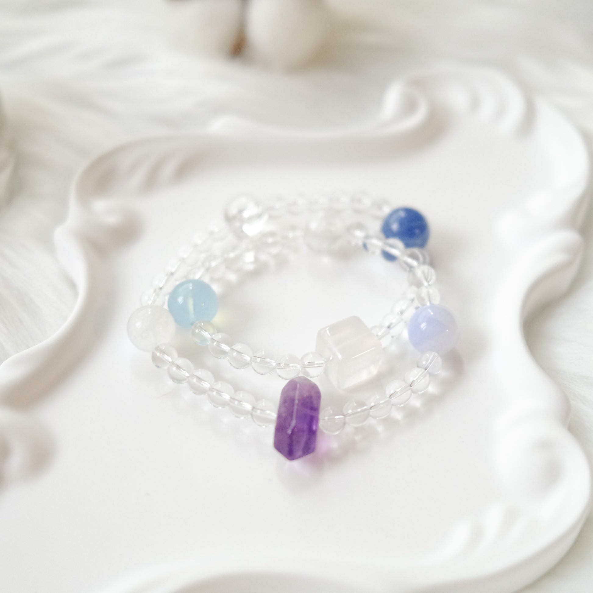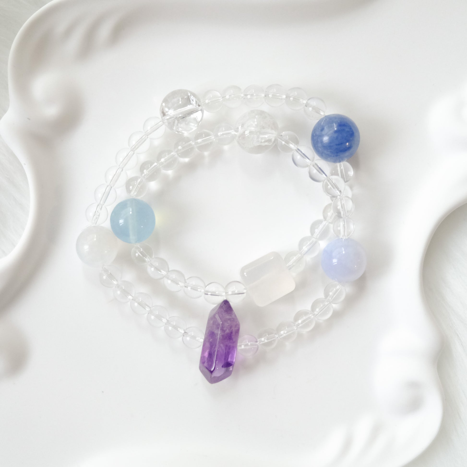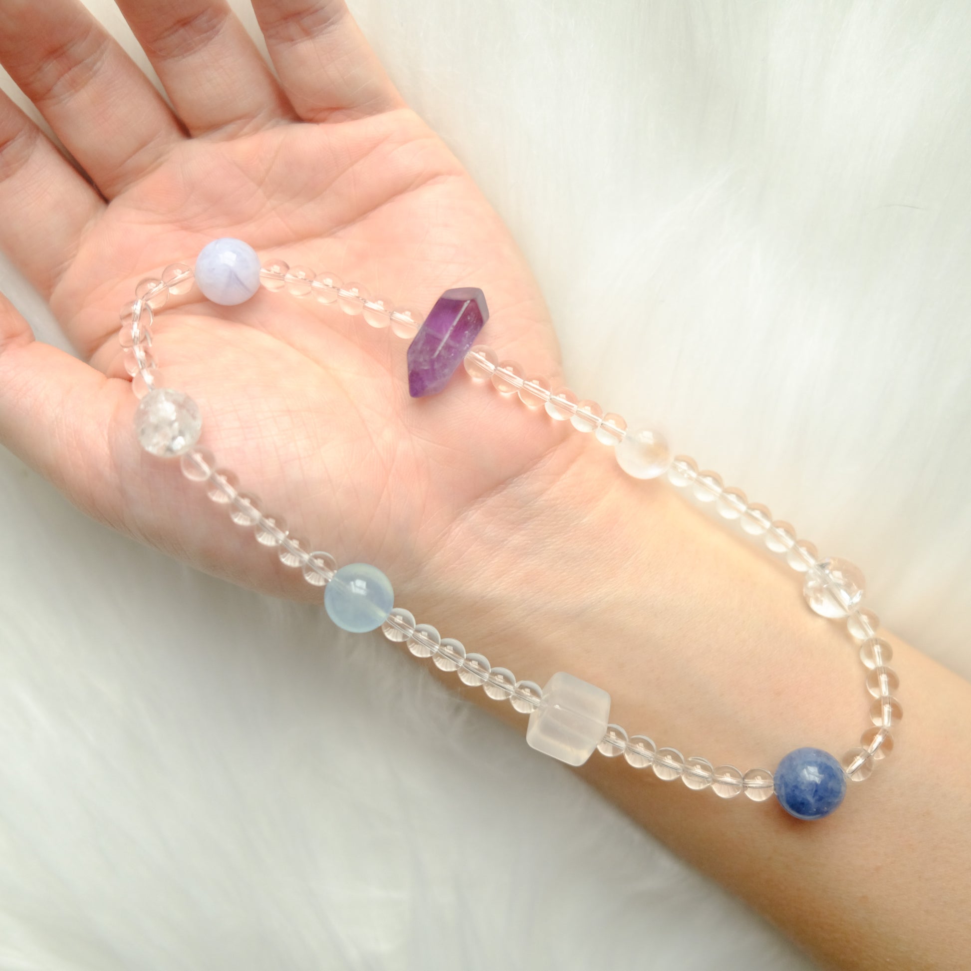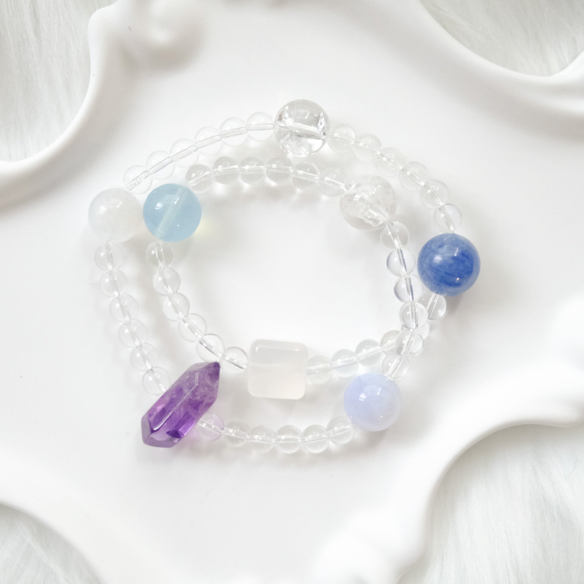Handcrafted with natural gemstones in soft blue, lavender, and moonlit white.