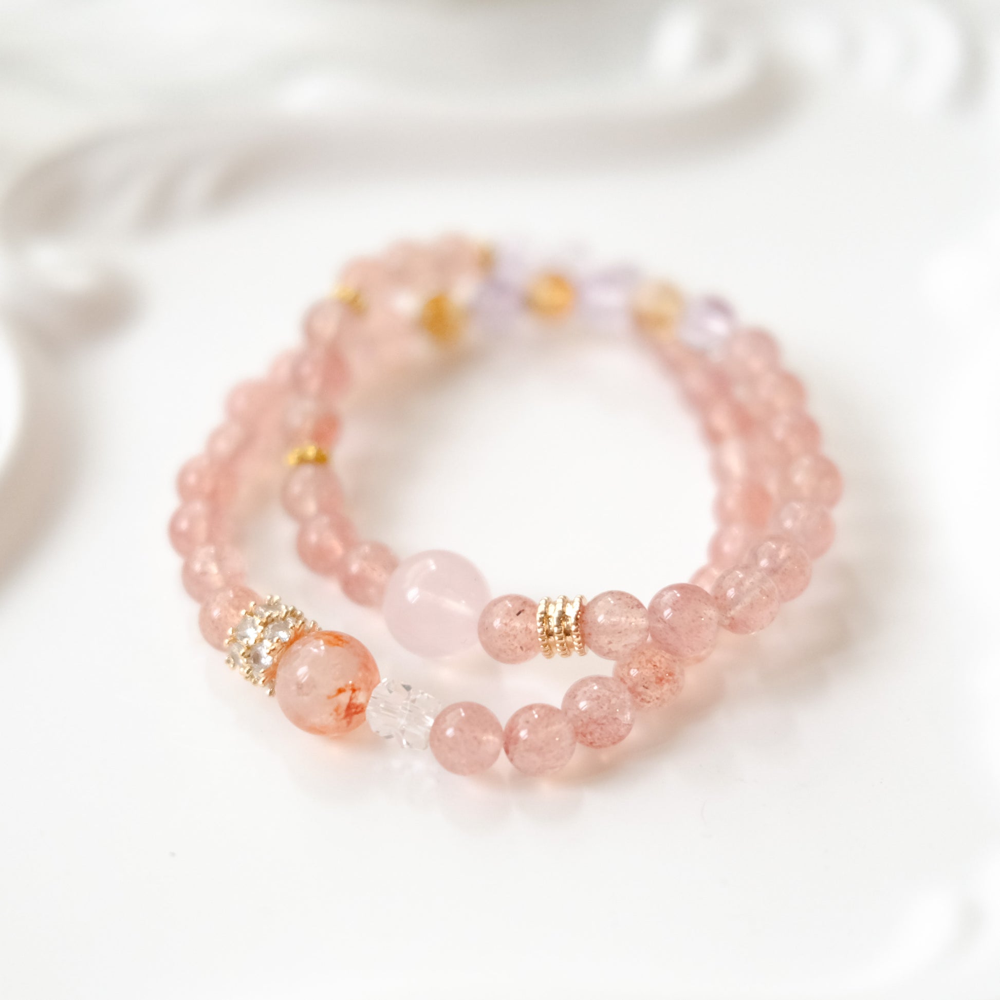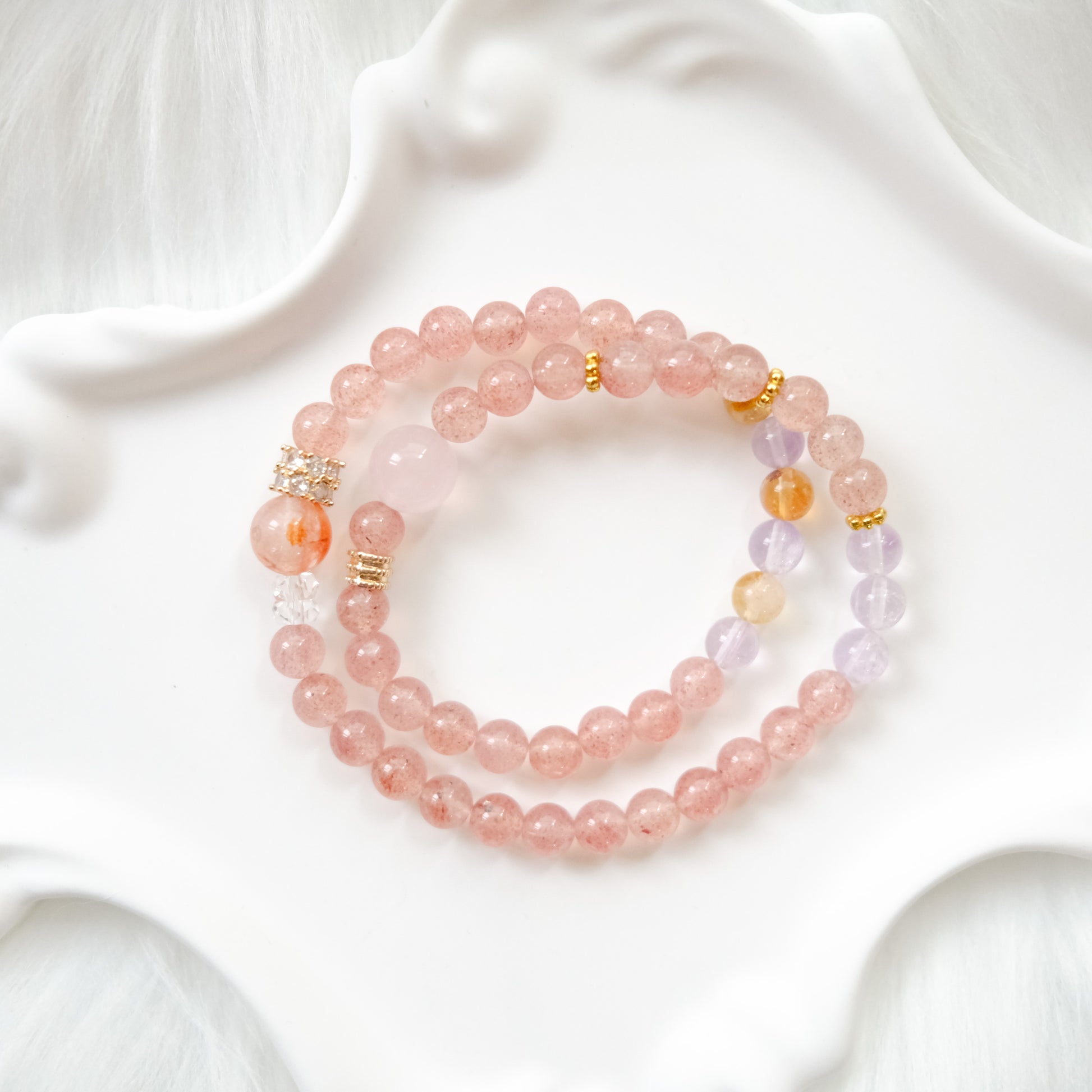 Handcrafted with carefully selected natural gemstones, each bead shows its own unique inclusions and colors — soft pink freckles of Strawberry Quartz, lilac transparency of Amethyst, milky glow of Rose Quartz, and warm golden tones of Citrine.
