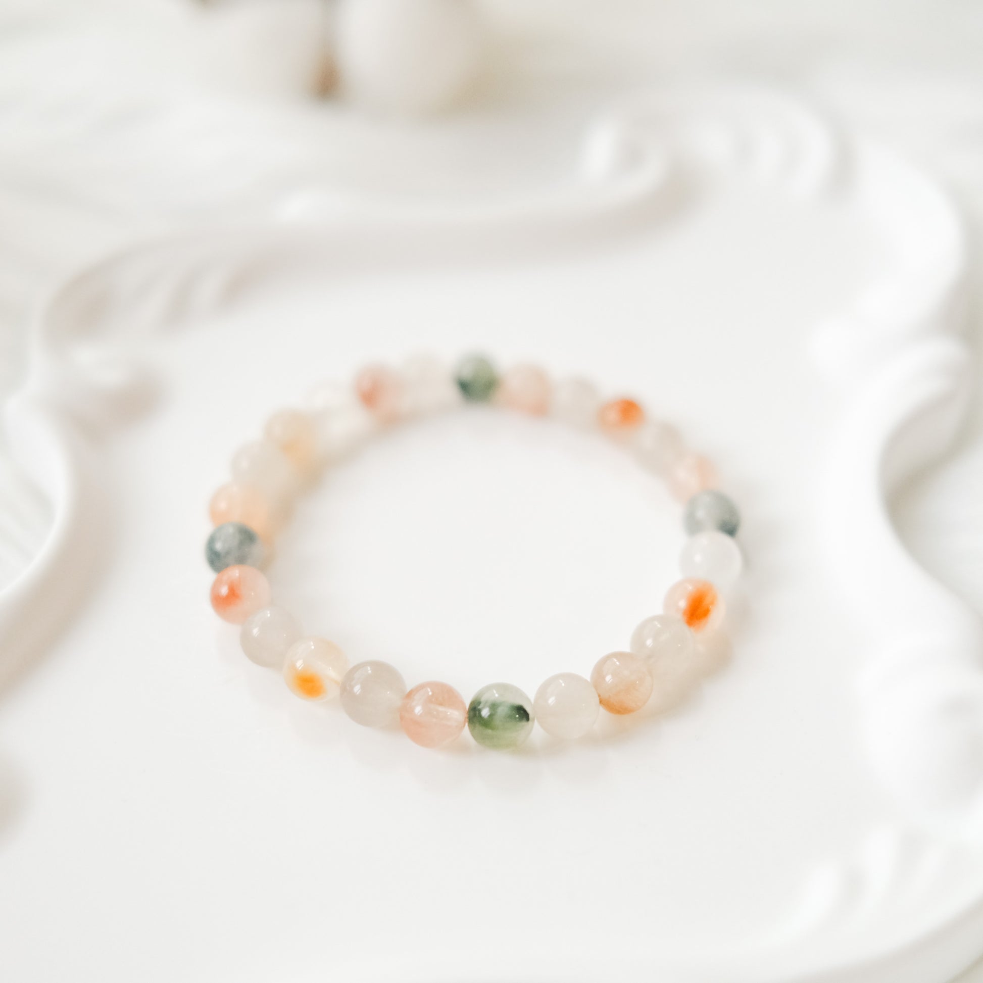 Each bead is hand-selected for its natural inclusions and watercolor-like pastel tones — no two beads are ever the same. The bracelet’s translucent glow and warm color palette create a soft, serene aesthetic suited for everyday comfort.