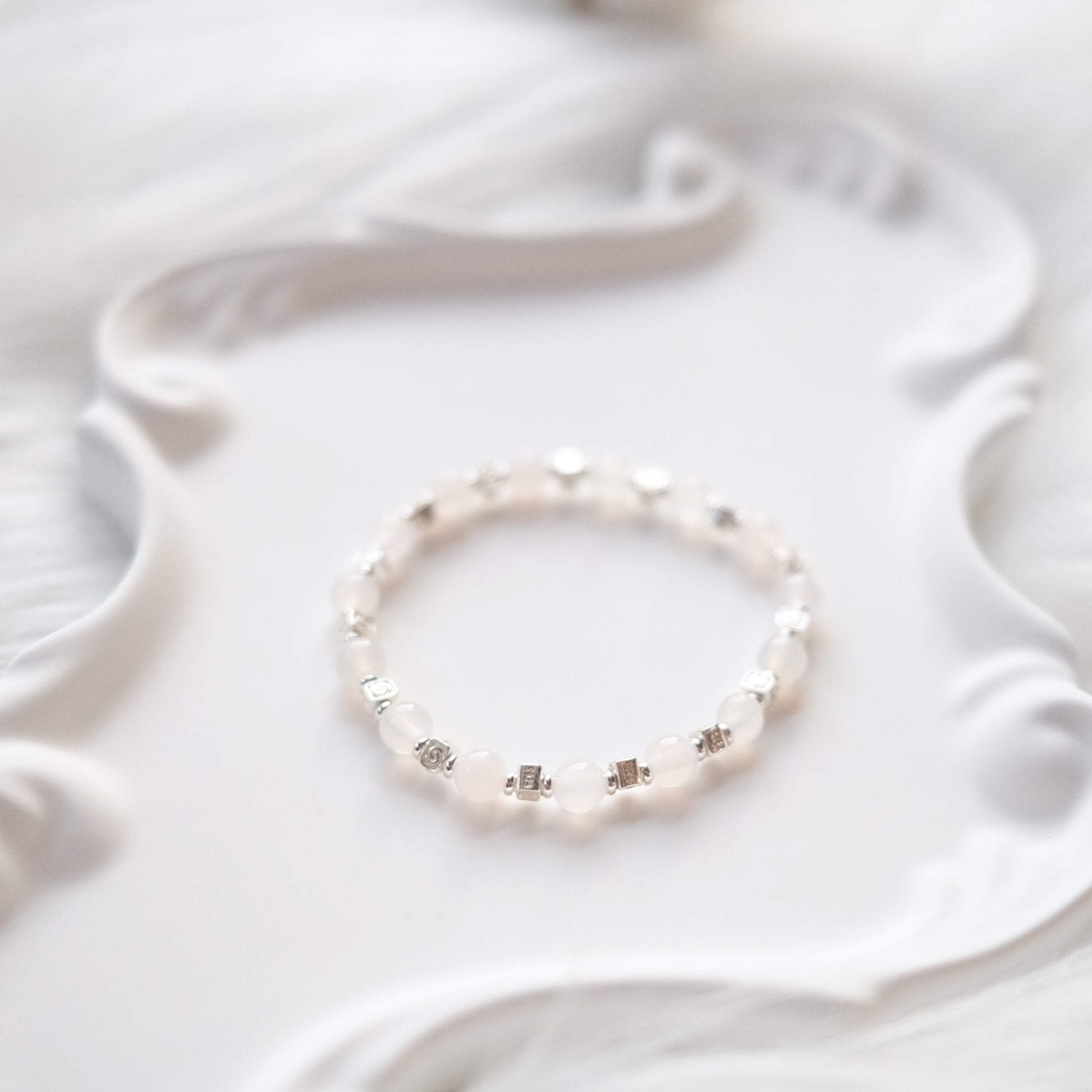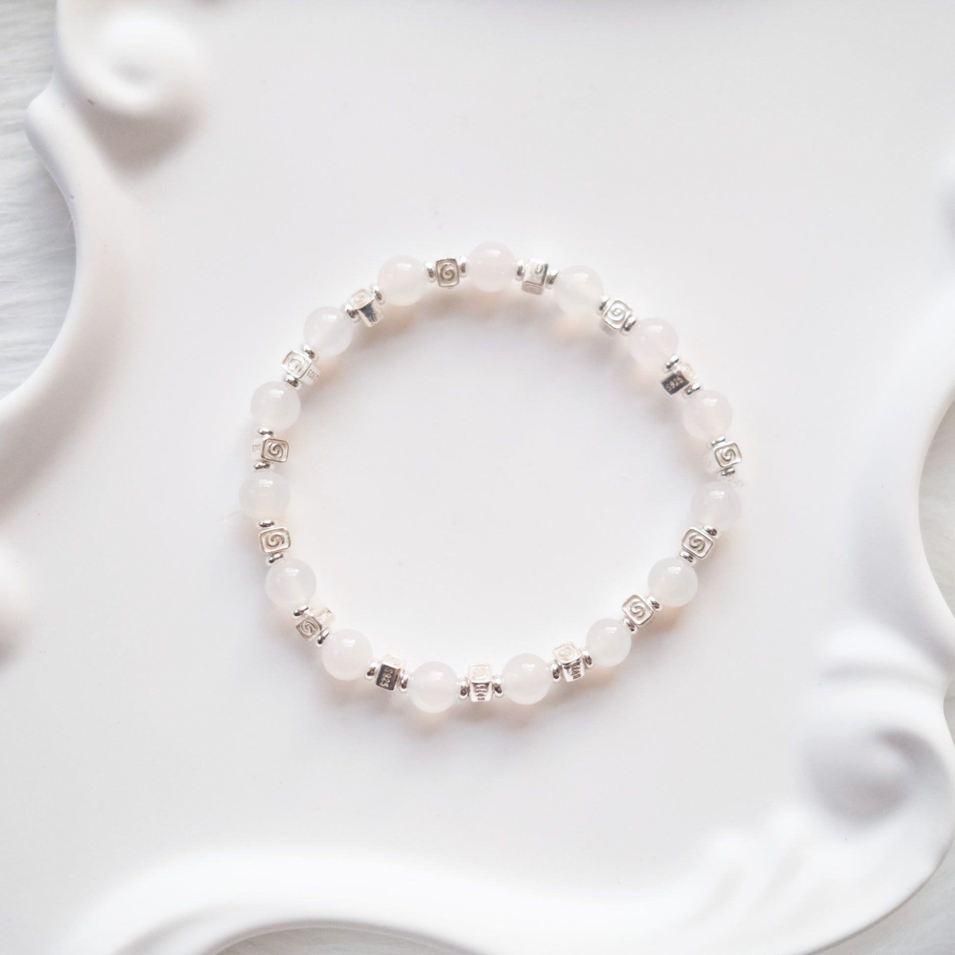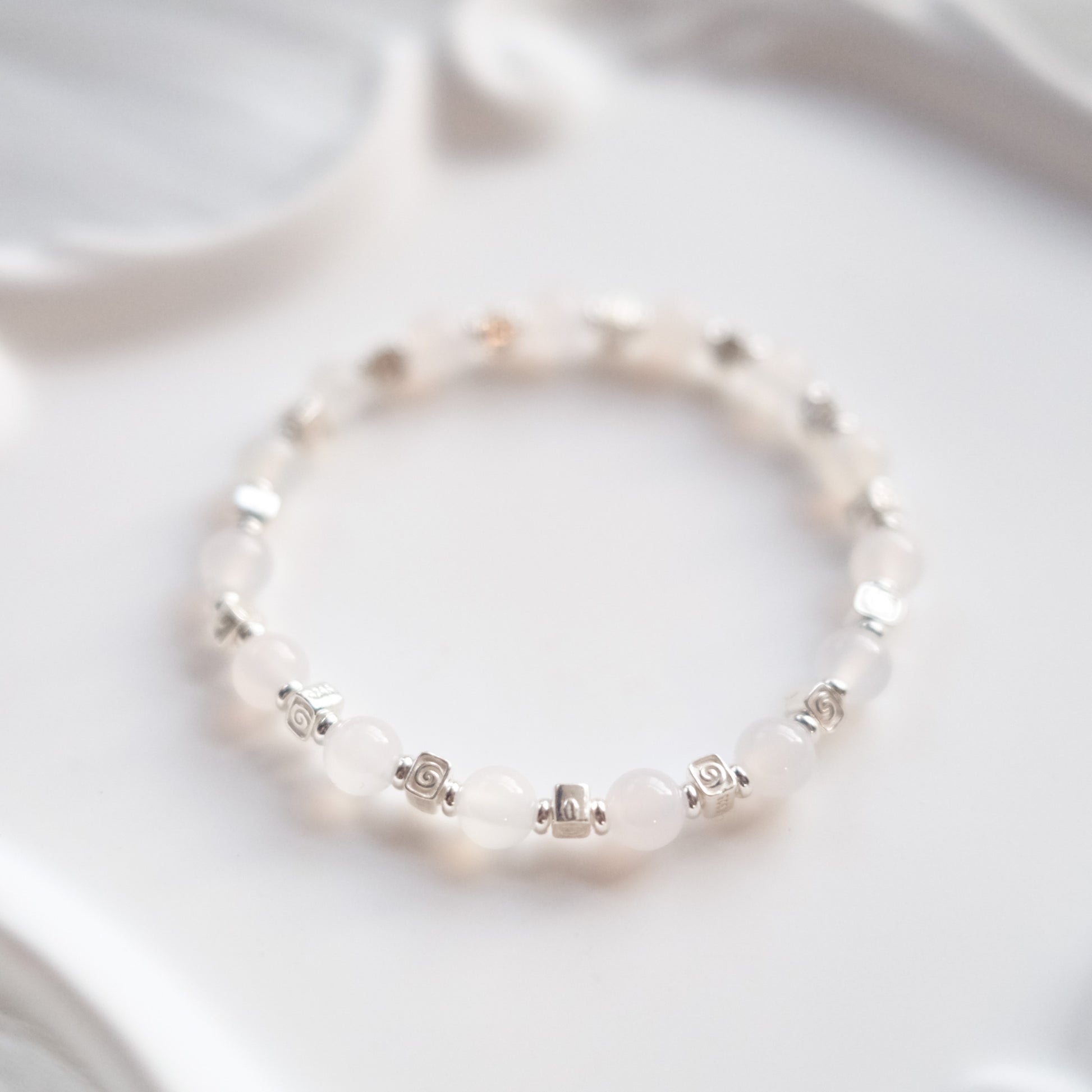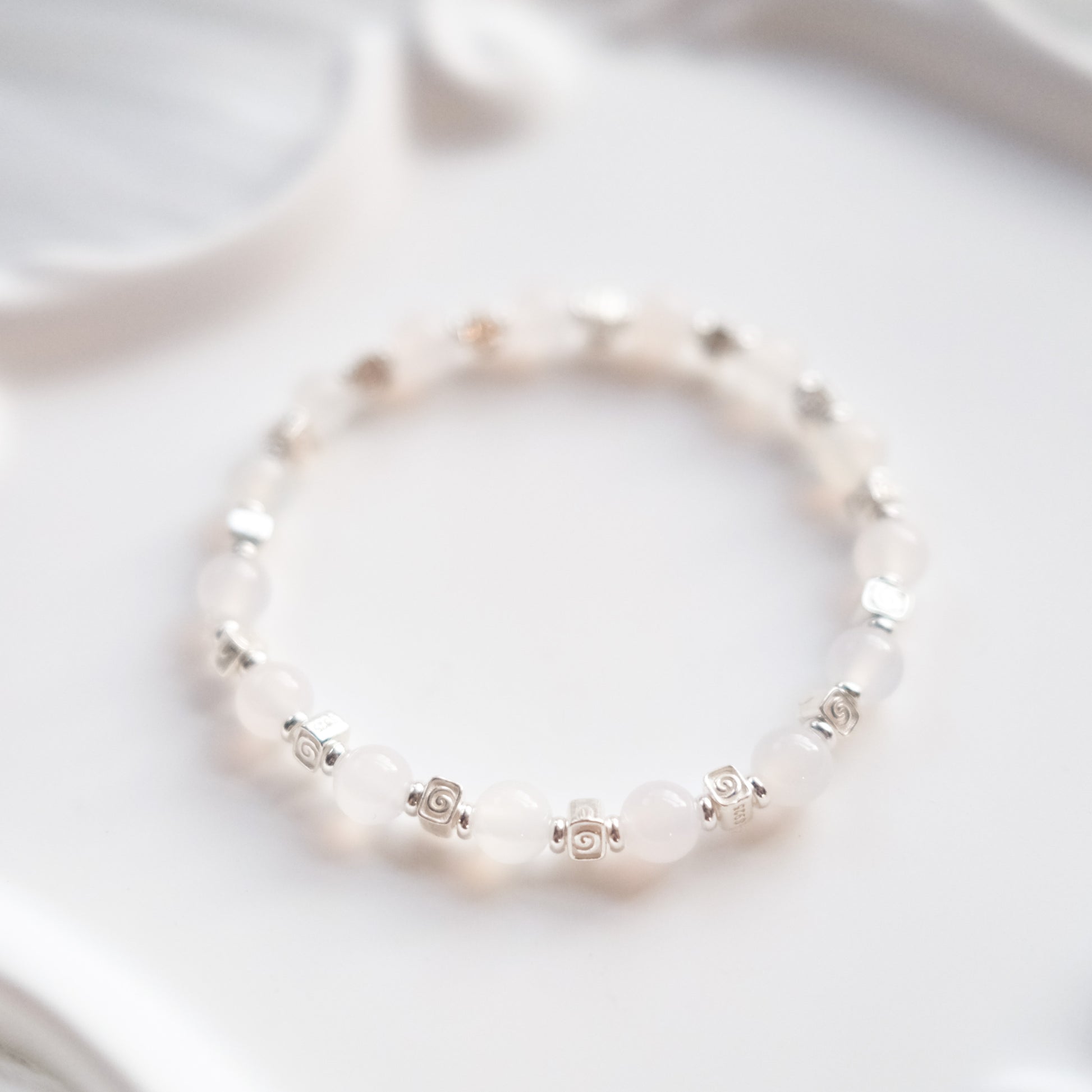 Handcrafted with natural White Chalcedony beads, each bracelet reveals subtle variations in translucence and tone, honoring the stone’s quiet beauty.